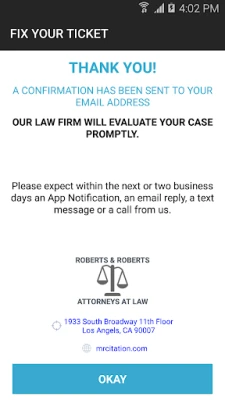 Welcome! to Fix Your Ticket® | Roberts & Roberts A Professional Law Corporation. By using this App you will be able to check the status of your case, capture a photo of your ticket, any court notice, your driver’s license, any other document concerning your citation and send it directly to us for review. Within a day or two we will be contacting you either by app-notification, email, text message or phone.